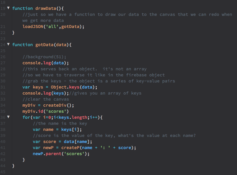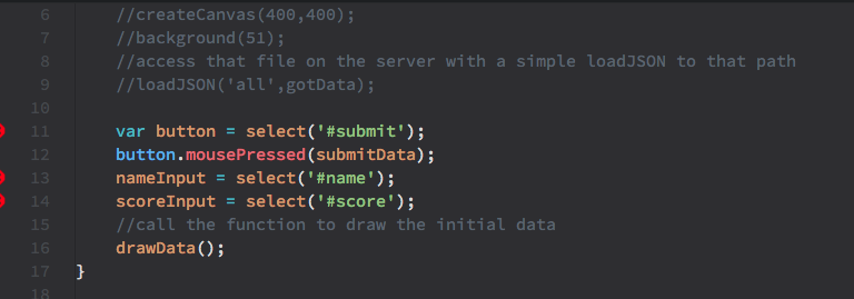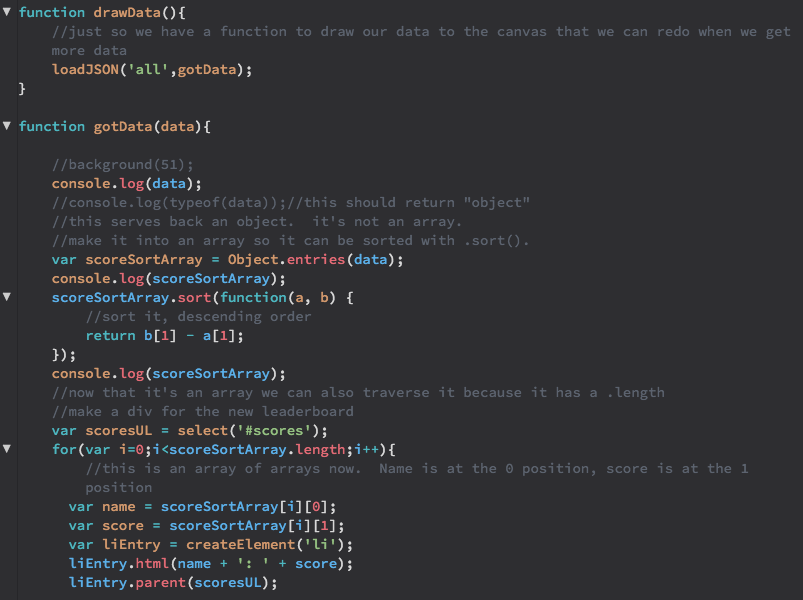 drawData() and its callback function, gotData() do the work of calling the stored scores back from the server and displaying these on the page. Like the function to submit data, drawData() also uses the loadJSON() method in p5. Note that in this function, the path that the function is loading is simply 'all'. gotData() then parses through the data and displays the scores in a div of p elements.