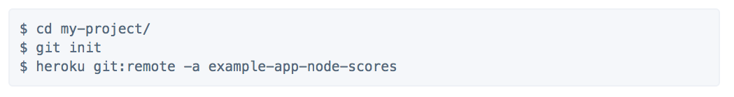 You should already be logged in to Heroku on the Terminal. Navigate to your app directory if you're not currently in it using the cd /path/to/my/folder command. Once you're in your main project directory, at the same level as the server.js file, and outside the "public" folder, initialize a "Git" in that directory with the following commands, replacing "example-app-node-scores" with your app name. You should have a version of this you can copy paste from your own App page on heroku:
