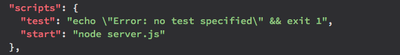 First, you'll want to update the package.json file to include some supplemental information for deploying on Heroku. Remember, package.json is like a meta-file that contains information about your app: it's creator, any licenses, it's dependencies. The first thing to add is a start command. Throughout this tutorial you've been starting your server with node server.js in the Terminal. Heroku will need this command written into the package file so it knows what command to run to start the app.