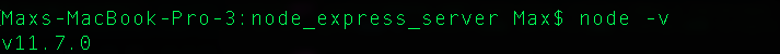 Next, you need to add the information about the current version of node you are using to your package.json file. Go back to the Terminal, stop your server and run the command node -v. When you hit enter you should see the version # of node you are using.