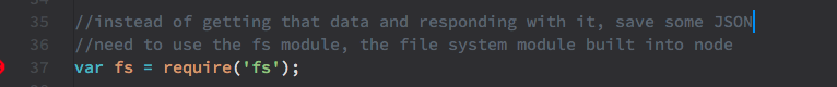var express = require('express');andvar app = express();load the express package (it's in the node modules folder now, but node knows where to find it), and create an instance of it in the variableapp. From now on, when you want to do things with express methods like .use() or .get(), you'll hook it toapp, as inapp.use().- The command to start the server and listen to a port is on line 13: