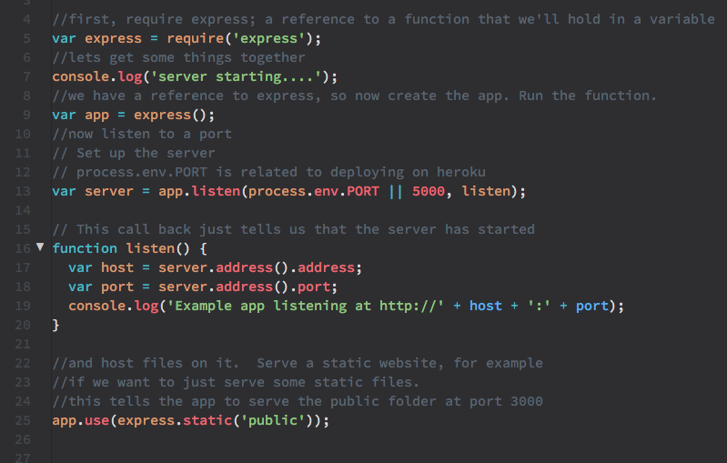 var server = app.listen(process.env.PORT || 5000, listen);. The syntax is structured precisely for uploading to Heroku, but this will also work for local development and start your server to serve things at port 5000 orhttp://localhost:5000. The "port" is an endpoint for messages. This is like opening a channel for your server to communicate with the frontend which will be displayed in a browser. function listen()is the callback for the function above. This just logs the server and port so you have easy access to the address. Theconsole.log()logs this to the console (your Terminal application, in this case) so you can easily copy/paste the local web address once the server has started.- The next command on line 25 actually points your app towards the public folder.