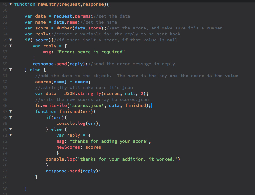 scoresobject withscores[name] = score. This makes each score in the object a key - value pair with the name as the key and the numerical score as the value. You could format this in many ways depending on your use-case before saving to .json. Remember: on the other end, when the data comes back to display client-side, app.js will also have to read this data in whatever way you format it here. var data = JSON.stringify(scores, null, 2)uses the JavaScript methodJSON.stringify(). The parameters here areJSON.stringify(obj, replacer, white space).- Finally